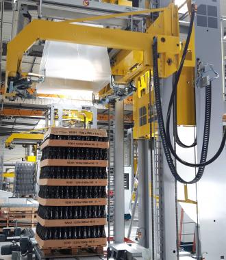 2. Le module de transfert prend en charge la housse, l'ouvre et la transfère au-dessus de la palette en cours d'introduction.